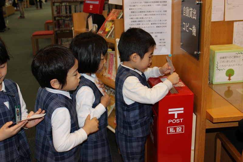 2019.04.18 中央図書館 郵便ポスト 除幕式 4月9日(火)中央図書館内に郵便ポスト設置の除幕式セレモニーにまつ組の20名が参加しました。その後、年長児が図書館への感謝の思いを書いたハガキをそれぞれ投函しました。北海道新聞と函館新聞に、記事が掲載されました。