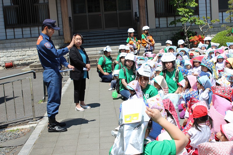 2019.06.04 避難訓練(消防車にさわる会) 5月24日(金)今回は消防隊の方にも来ていただき、避難訓練をしました。 消防車を間近で見ることができ、いろいろなものが積んであることを知りました。 逃げる際の約束「お・は・し・も」をしっかり、消防隊の方に約束しました。